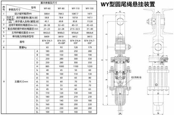 WY系列圓尾繩懸掛裝置主要由連接叉,上下連接銷軸、主吊桿、單向推力球軸承、繩頭連接套、連接螺桿、開槽螺母、連接套管、軸承套、深溝球軸承、密封圈等組成。在整體結(jié)構(gòu)上,可分為固定不動(dòng)的主吊桿和連接套通過連接螺桿連接支撐座。其間通過單向推力球軸承實(shí)現(xiàn)了自由轉(zhuǎn)動(dòng)。可以避免了平衡鋼絲繩扭繩現(xiàn)象的發(fā)生。