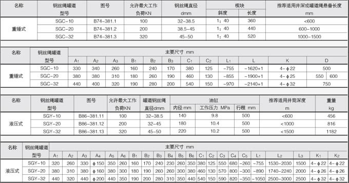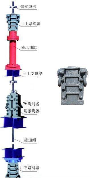 (10)使用一段時(shí)間后,當(dāng)活塞達(dá)到最大行程,需要將活塞竄至下部起點(diǎn)位置時(shí),必須用已準(zhǔn)備好的臨時(shí)固定裝置將罐道繩固定,打開繩卡、雙楔塊固緊器及松開螺母,排出液壓缸內(nèi)的存油,活塞即退回到起點(diǎn)位置,然后再按步驟9調(diào)整罐道繩張緊力。